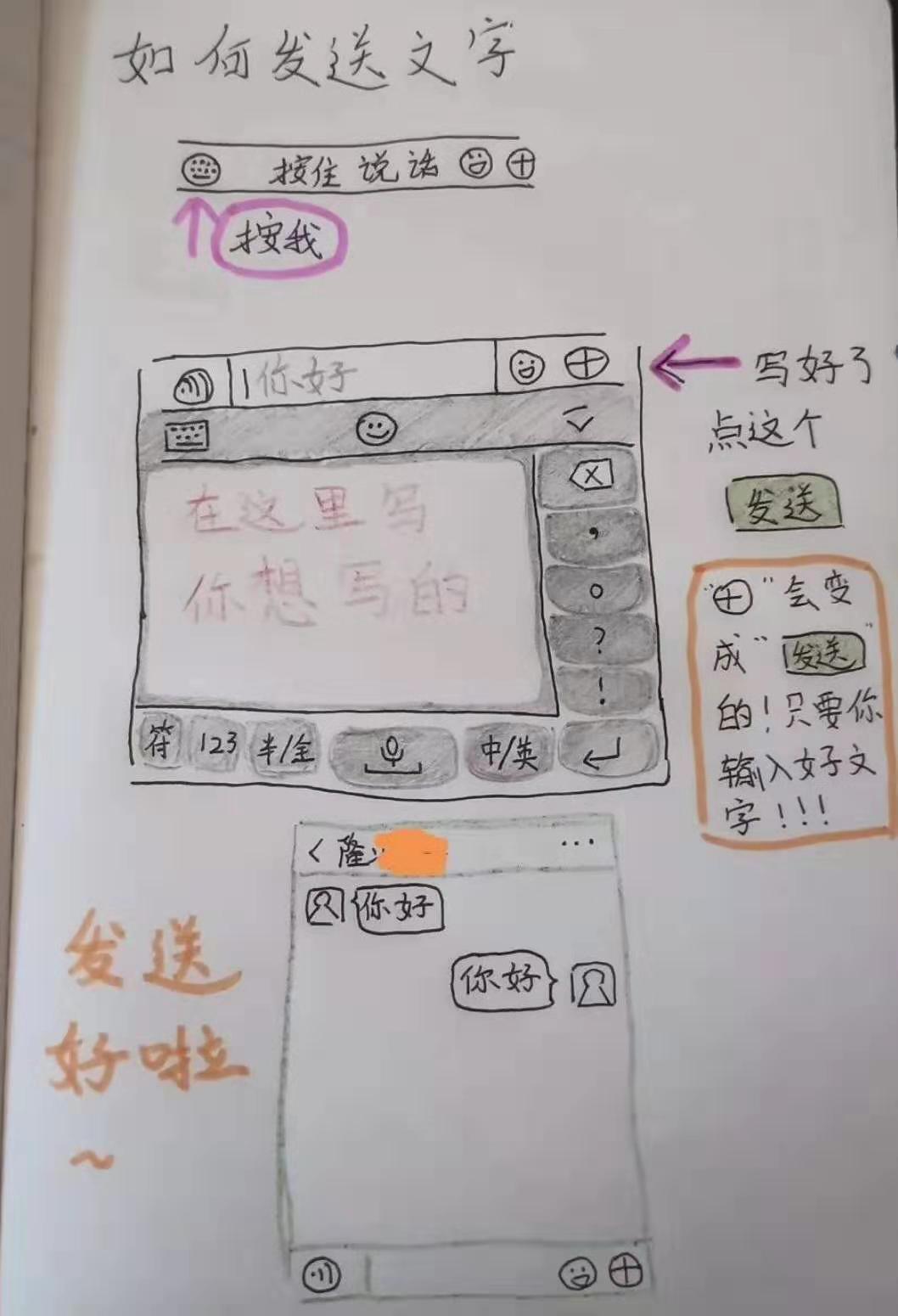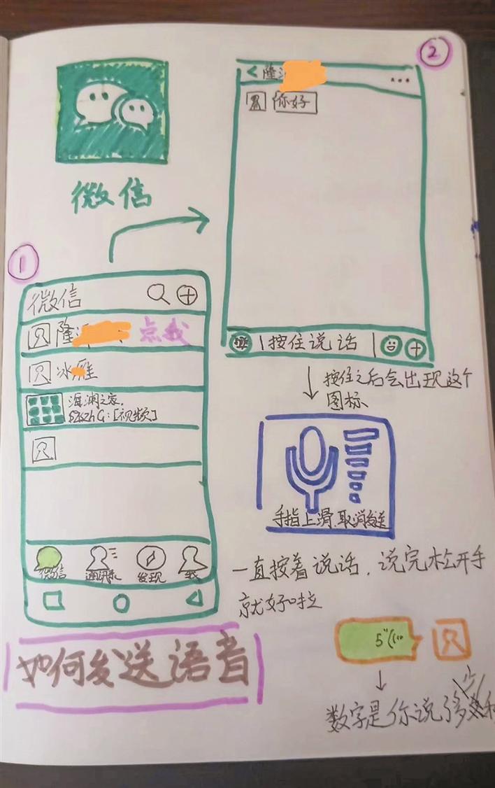 這是其侄女隆沂珊為了教會奶奶使用社交軟件特別畫的。圖文并茂地記錄了如何發(fā)送語音、如何發(fā)送文字等等,十分通俗易懂。