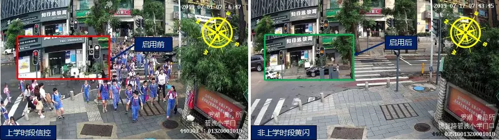 羅湖黃貝/德智路口上下學(xué)期間采取燈控設(shè)置,規(guī)范路口內(nèi)行車秩序,保證機(jī)動車與行人的安全。因暑期行人、機(jī)動車流量均明顯減少,蜀黍采取全天黃閃控制,提高機(jī)動車通行效率。