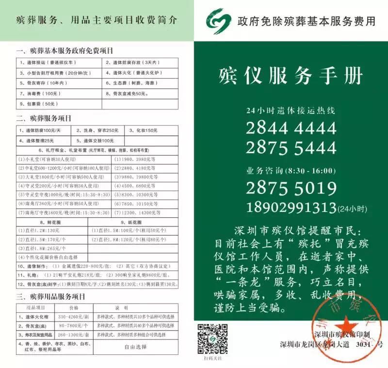“深圳只有一家合法的殯儀館,就是深圳市殯儀館,其殯儀收費標(biāo)準(zhǔn)可以通過‘深圳民政在線’的‘殯儀服務(wù)’查詢?!笔袣浌芩嚓P(guān)負(fù)責(zé)人表示,市民也可以關(guān)注“深圳市殯儀館”的微信公眾號查詢治喪流程、聯(lián)系電話和收費標(biāo)準(zhǔn)。