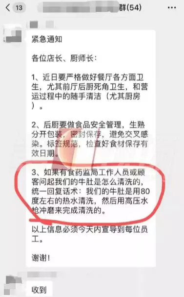 這張聊天截圖顯示:前晚7點(diǎn)54分,八合里的一個內(nèi)部群,發(fā)出了一則緊急通知,要求店長、廚師長近期要做好餐廳各方面衛(wèi)生,后廚要做好食品安全管理。如果有食藥監(jiān)局工作人員或顧客詢問,牛肚是怎么清洗的,統(tǒng)一回復(fù)的話術(shù)是:我們的牛肚是用80度左右的熱水清洗,然后用高壓水槍沖磨來完成清洗的。
