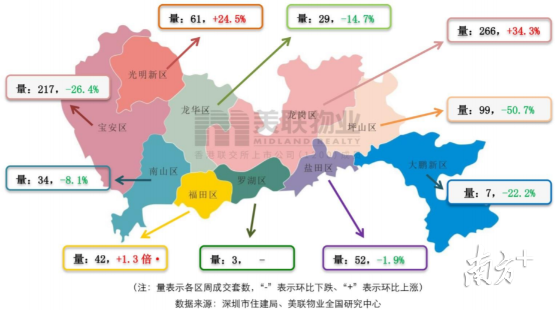 按照十區(qū)的成交分布來(lái)看,除羅湖無(wú)對(duì)比數(shù)據(jù)外,上周福田、龍崗和光明三區(qū)一手住宅成交量環(huán)比呈上升趨勢(shì),深圳其余六區(qū)一手住宅成交套數(shù)均下降。其中龍崗區(qū)和寶安區(qū)分別以266套和217套的成交量居于成交排行前兩位,環(huán)比分別上升34.3%和下降26.4%。而成交42套的福田區(qū)成為上周一手住宅成交量環(huán)比增幅最大的區(qū),增幅約1.3倍。