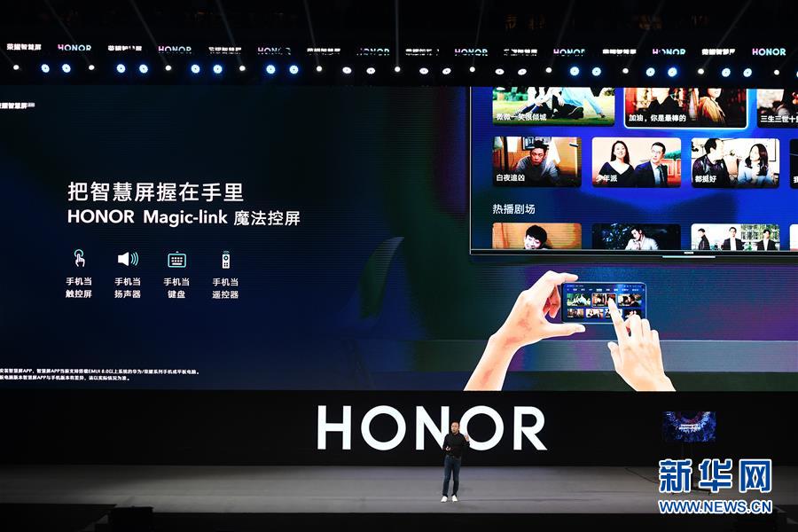 8月10日,華為榮耀總裁趙明在發(fā)布會上介紹榮耀智慧屏。新華社記者梁旭攝