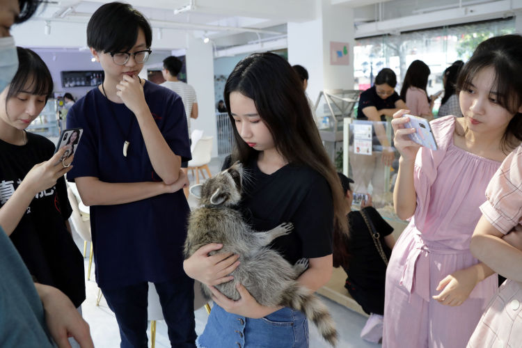 除了小動(dòng)物和飼養(yǎng)員們,這里還聚集了許多年輕女孩兒,她們有的相互認(rèn)識(shí),輪流跟店里的小浣熊撓癢癢拍照;有的不認(rèn)識(shí)彼此,卻因?yàn)轱曫B(yǎng)過(guò)同樣的小動(dòng)物而熟絡(luò)起來(lái),相互傳授養(yǎng)育自家"孩子"的經(jīng)驗(yàn)。這只名為"六一"的小浣熊是這里的常駐小動(dòng)物,面對(duì)市民們的熱情,"六一"毫不客氣地躺在小姐姐的臂彎里撒嬌,引來(lái)其他市民們爭(zhēng)相拍照。