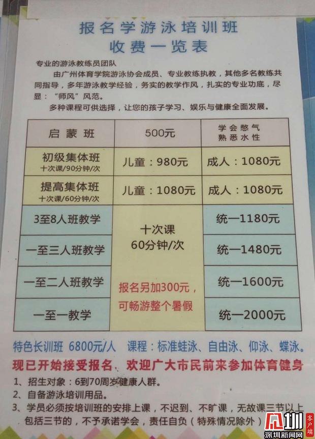 記者采訪獲悉,龍崗區(qū)華南城附近某游泳培訓(xùn)班,已推出了游泳中考滿(mǎn)分班項(xiàng)目,價(jià)格為28000元,三年內(nèi)可無(wú)限次數(shù)上課;對(duì)中考體育游泳科目分?jǐn)?shù)要求在80分的,價(jià)格為20000元,課時(shí)不限。
