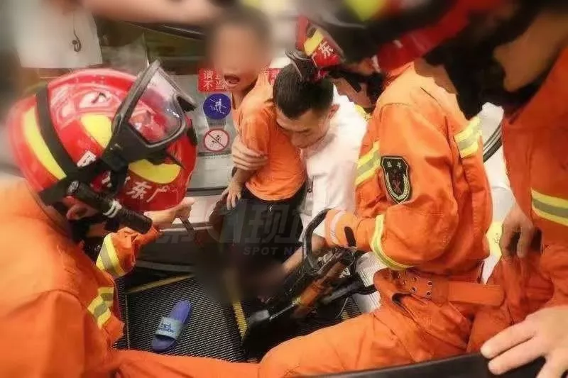 到達(dá)現(xiàn)場后,消防人員發(fā)現(xiàn),小孩前腳掌已卡進手扶電梯內(nèi),都嚇得大哭。經(jīng)過消防人員奮力營救,成功救出被卡小孩,交給120救護人員送往醫(yī)院。