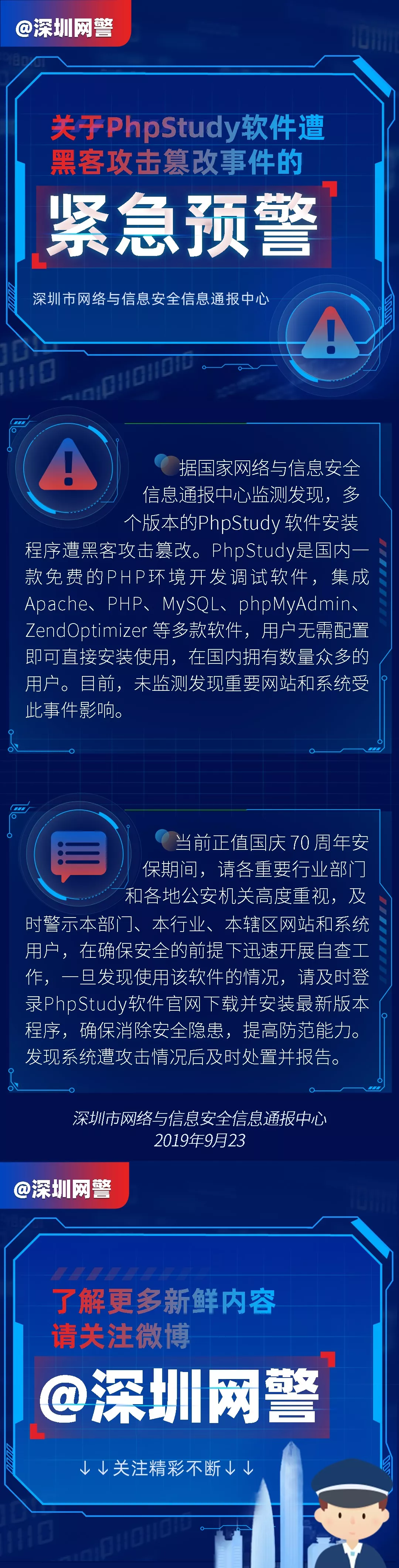當前正值國慶70周年安保期間,請各重要行業(yè)部門和各地公安機關高度重視,及時警示本部門、本行業(yè)、本轄區(qū)網(wǎng)站和系統(tǒng)用戶,在確保安全的前提下迅速開展自查工作。
