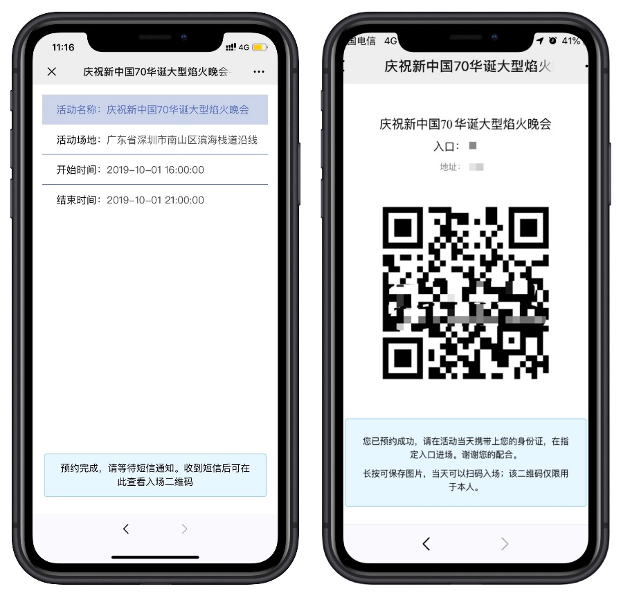 4.預(yù)約成功后將收到短信,預(yù)約頁面將生成二維碼。請?zhí)崆皩⒍S碼妥善保存,活動當(dāng)天市民需憑此二維碼及本人身份證入場(二維碼轉(zhuǎn)借他人無效)。