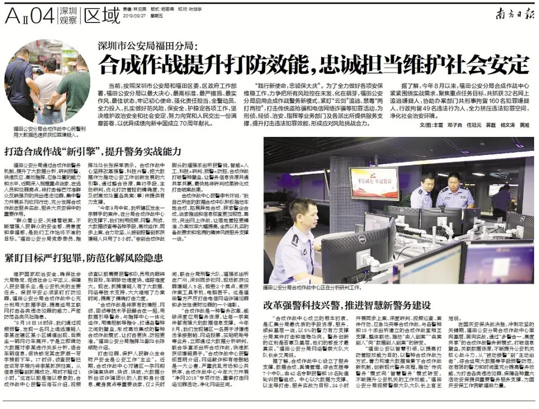 在大慶安保決戰(zhàn)決勝、沖刺攻堅的關(guān)鍵期,福田公安分局合成作戰(zhàn)中心面向基層、面向?qū)崙?zhàn),通過“多警合一、高度共享”的合成作戰(zhàn)警務(wù)新模式,打破信息壁壘,關(guān)聯(lián)數(shù)據(jù)資源,不斷提升公安機關(guān)核心戰(zhàn)斗力,從“被動接警”到“主動出擊”,綜合運用大數(shù)據(jù)等手段預(yù)警防范,為在有限的警力和時間里充分提高警務(wù)效能,為打擊各類違法犯罪、保障各種重大活動安保提供重要警務(wù)服務(wù)支撐,為大慶安保工作貢獻福田力量。