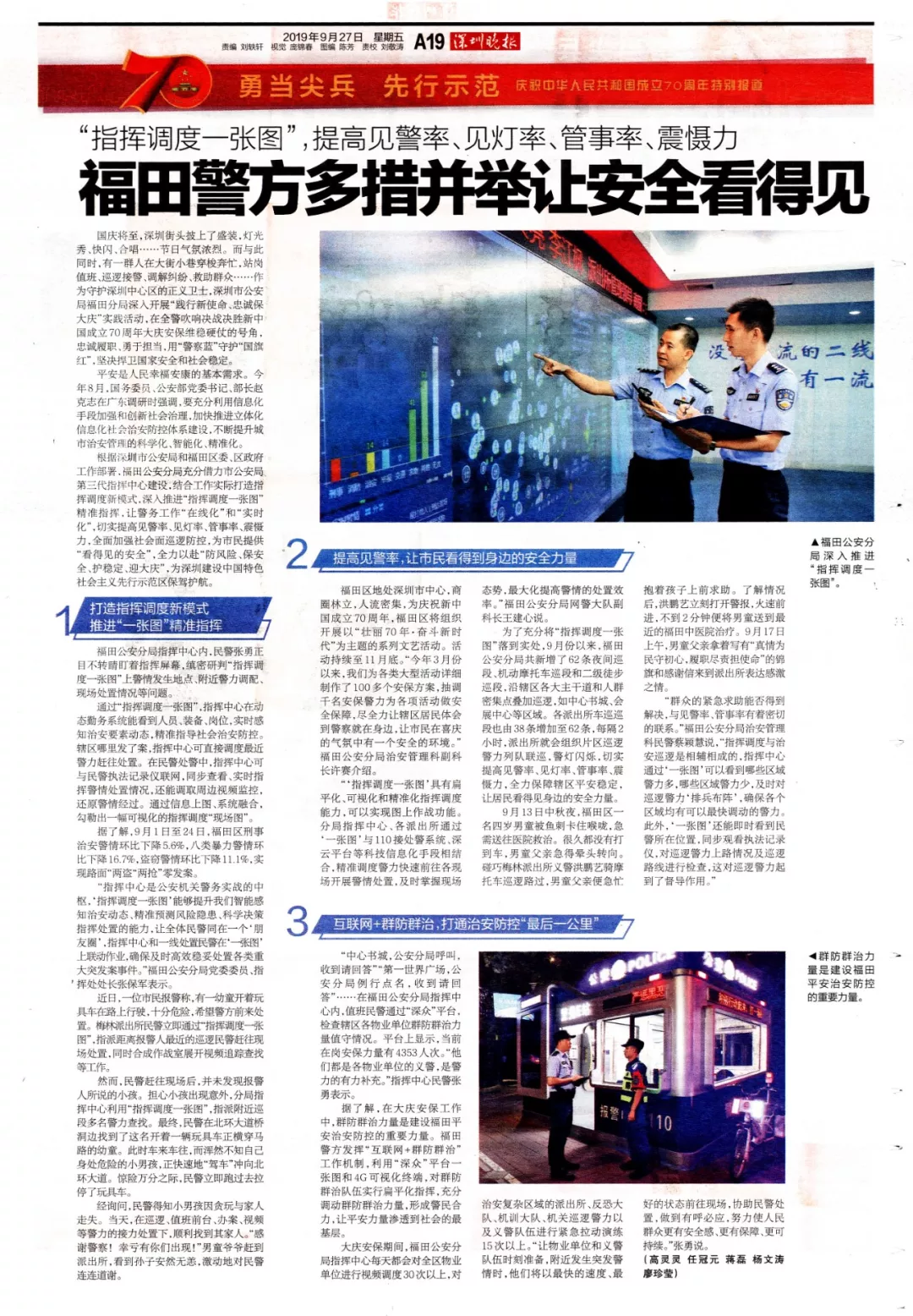 根據(jù)深圳市公安局和福田區(qū)委、區(qū)政府工作部署,福田公安分局充分借力市公安局第三代指揮中心建設(shè),結(jié)合工作實際打造指揮調(diào)度新模式,深入推進“指揮調(diào)度一張圖”精準指揮,讓警務(wù)工作“在線化”和“實時化”,切實提高見警率、見燈率、管事率、震懾力,全面加強社會面巡邏防控,為市民提供“看得見的安全”,全力以赴“防風險、保安全、護穩(wěn)定、迎大慶”,為深圳建設(shè)中國特色社會主義先行示范區(qū)保駕護航。