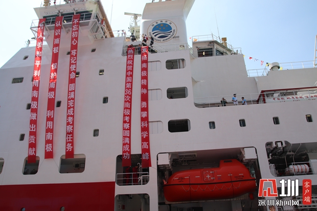 雪龍2號(hào)上的船員和科考隊(duì)員向岸上的送別人群揮手告別,“感謝祖國(guó)、感謝深圳!”