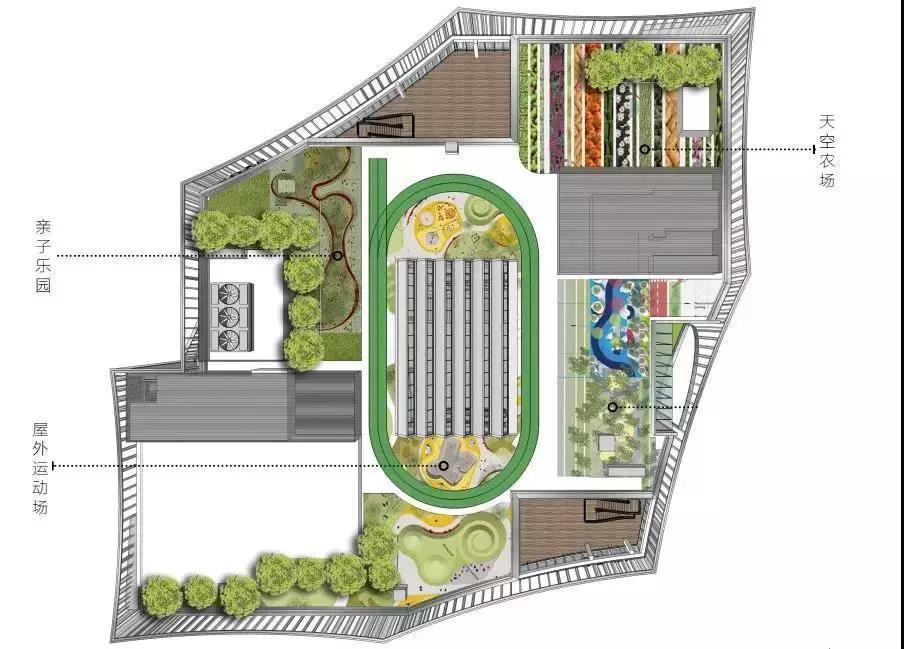 屋頂農(nóng)場充分利用空間,打造天空農(nóng)場、親子樂園、屋外運(yùn)動場??罩械呐艿溃饰值耐寥?,瓜果蔬菜的金色豐收,讓自然在城市落地生根。小朋友們可以在其中,種植汗水,開花結(jié)果,收獲自然的饋贈。