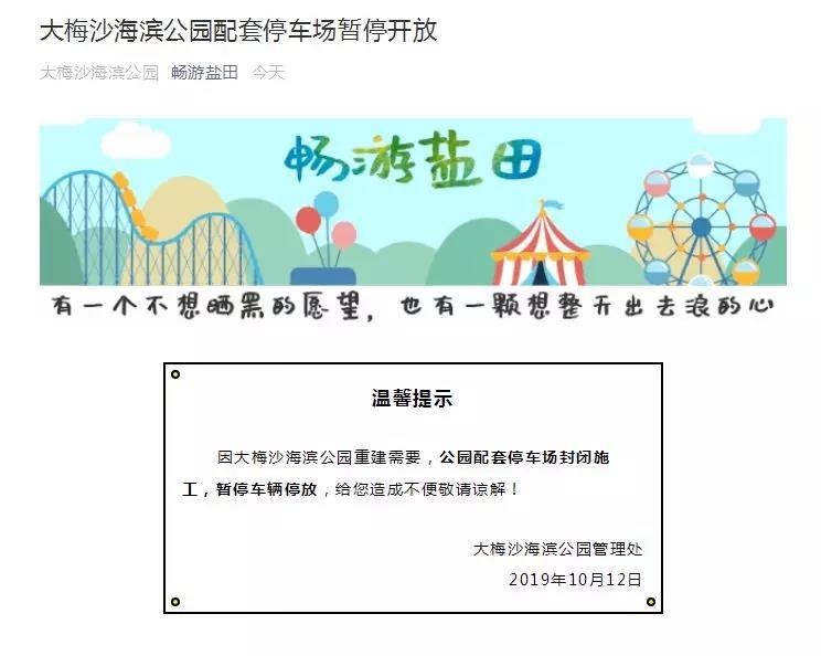 另外,大梅沙海濱公園管理處2019年10月12日發(fā)布公告稱:因大梅沙海濱公園重建需要,公園配套停車場封閉施工,暫停車輛停放。