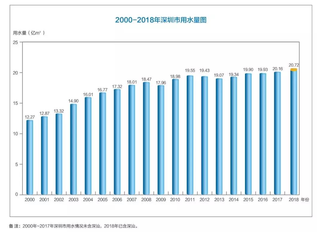 2000-2018年,深圳市用水量整體呈現(xiàn)遞增趨勢。2018年,深圳市(未含深汕合作區(qū))萬元GDP用水量8.41立方米,位列全國大城市前列。