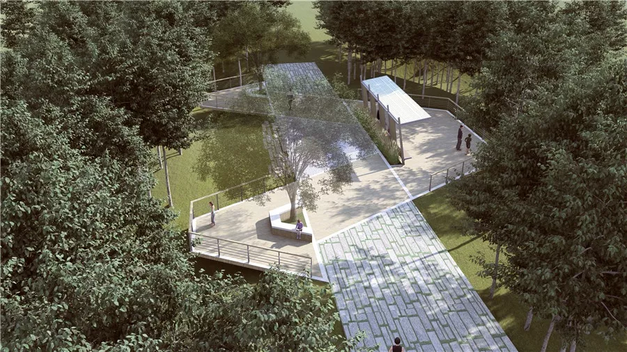 利用現(xiàn)狀平臺進行改造提升,場地形式由“人”字演化而來,廊架也取自“人”形元素進行設計,平臺北向俯瞰群賢廣場,南面則朝向求知花園,具有一攬眾英才之意。