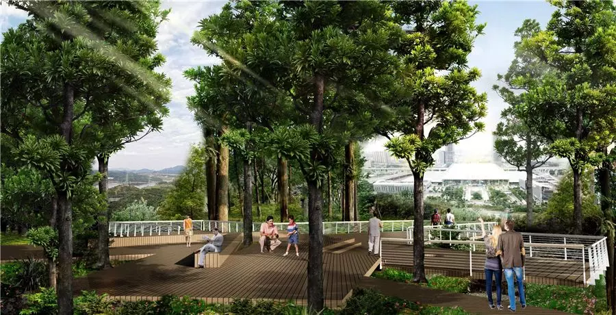 充分利用山頂?shù)匦?,以“人+才”的形式組合而成,取名為人才臺。節(jié)點視線佳,東望深圳北站商務(wù)區(qū),西眺長嶺陂水庫,是一個絕佳的休憩觀景平臺。