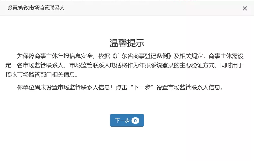 第二步:系統(tǒng)自動彈出市場監(jiān)管聯(lián)系人設(shè)置提示框,閱讀完成后點(diǎn)擊“下一步”。