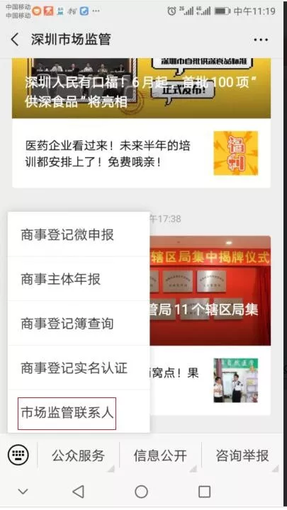 商事主體關(guān)注“深圳市場監(jiān)管”微信公眾號,點(diǎn)擊“公眾服務(wù)-市場監(jiān)管聯(lián)系人”,可設(shè)置、修改市場監(jiān)管聯(lián)系人信息。