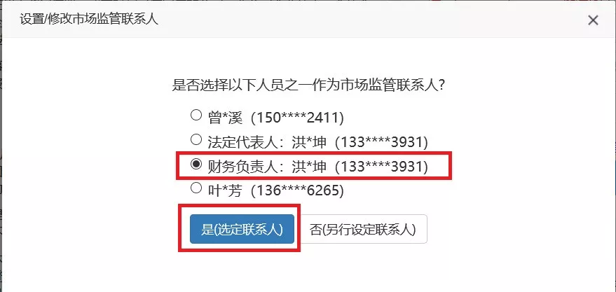 第三步:彈出備選的市場監(jiān)管聯(lián)系人信息,選擇一名,點(diǎn)擊“是(選定聯(lián)系人)”。
