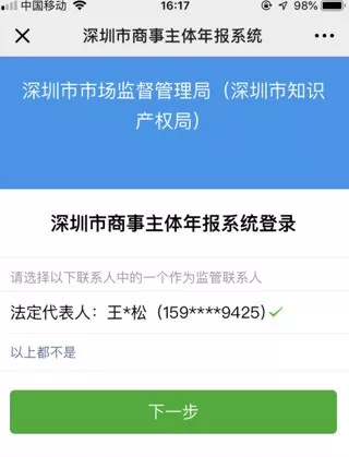 第三步:系統(tǒng)自動彈出市場監(jiān)管聯(lián)系人備選項,選擇市場監(jiān)管聯(lián)系人后,點(diǎn)擊下一步。
