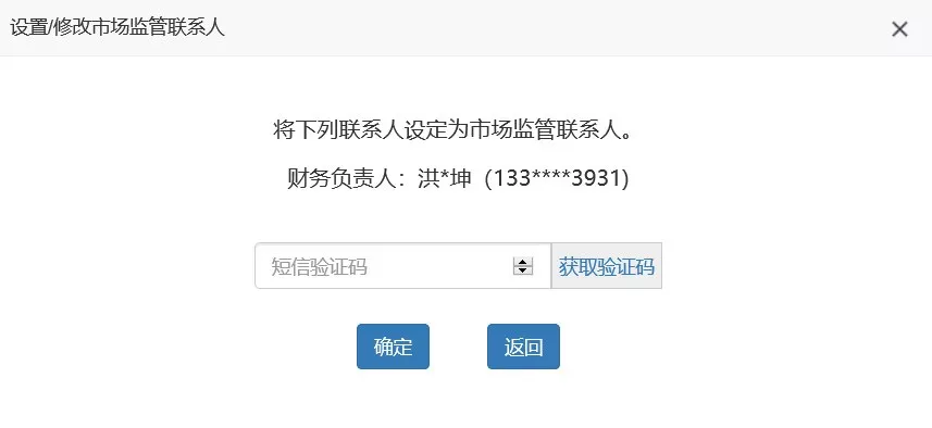 第四步:輸入收到的驗(yàn)證碼,點(diǎn)擊“確定”,完成市場監(jiān)管聯(lián)系人設(shè)置。