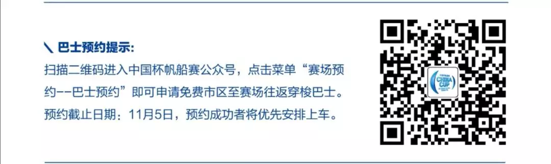 掃描二維碼進(jìn)入中國(guó)杯帆船賽公眾號(hào),點(diǎn)擊菜單“賽場(chǎng)預(yù)約-巴士預(yù)約”,即可申請(qǐng)免費(fèi)市區(qū)至賽場(chǎng)往返穿梭巴士。預(yù)約截止日期:11月5日,預(yù)約成功者將優(yōu)先安排上車(chē)。