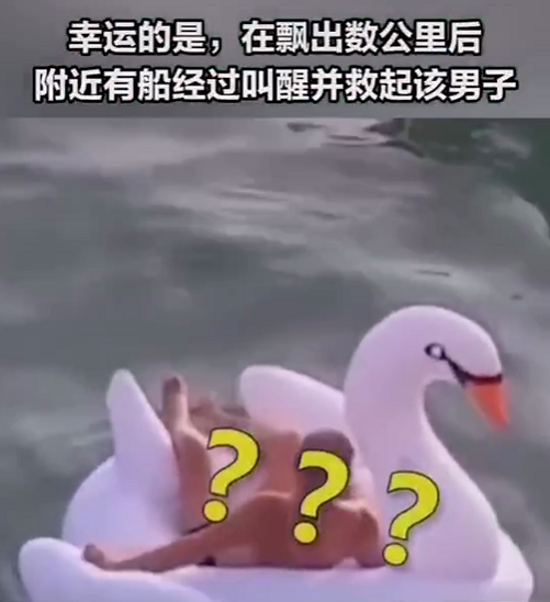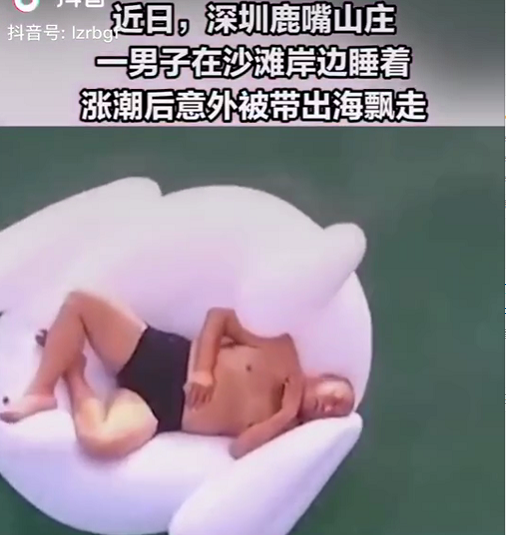 最近,有個(gè)視頻很火。視頻中標(biāo)注:一男子在深圳鹿嘴山莊游玩時(shí),躺在天鵝氣墊上睡著了,漲潮后被帶出海飄走,在飄出數(shù)公里后他被經(jīng)過(guò)的船叫醒并救起。