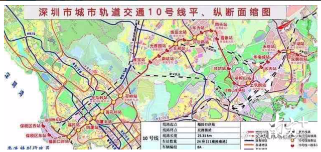 地鐵10號(hào)線,南連與香港毗鄰的福田口岸站,北接龍崗區(qū)雙擁街,線路全長(zhǎng)約29公里,共設(shè)車站24座。