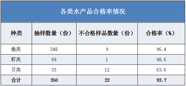 此外,水產品中魚類不合格樣品數量為9份;蝦類1份;貝類12份樣品不合格。