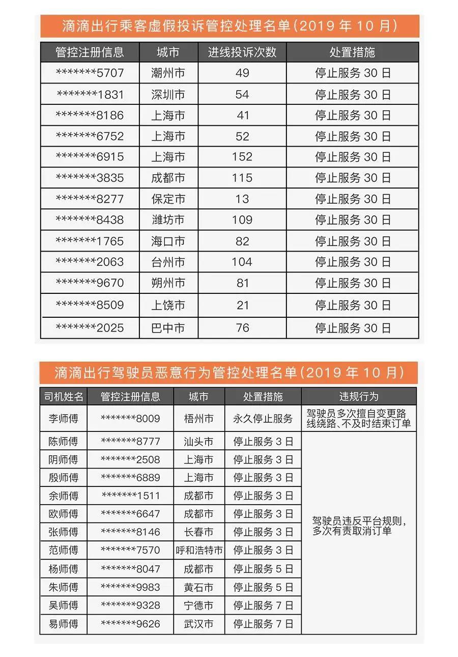 晶報2019年11月20日訊 11月20日,滴滴出行通過官方微信公眾號對10月違規(guī)司、乘“黑名單”進行了公示。乘客黑名單中,惡意投訴次數(shù)最多的高達152次;司機黑名單中一位梧州市的李師傅因多次擅自變更路線繞路、不及時結(jié)束訂單等違規(guī)行為被永久停止服務(wù)。