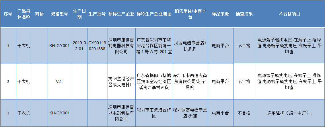 晶報(bào)2019年11月20日訊 近日,江蘇省市場(chǎng)監(jiān)管局對(duì)衣物干燥機(jī)產(chǎn)品質(zhì)量進(jìn)行了監(jiān)督抽查,共抽查50批次。抽查結(jié)果顯示,合格30批次,不合格20批次。其中,深圳有3批次不合格。分別是深圳市康佳智能電器科技有限公司生產(chǎn)的2批次干衣機(jī),及揭陽空港經(jīng)濟(jì)區(qū)威克電器廠生產(chǎn)的在深圳市卡西道夫商貿(mào)有限公司、蘇寧易購(gòu)等電商平臺(tái)銷售的干衣機(jī)。