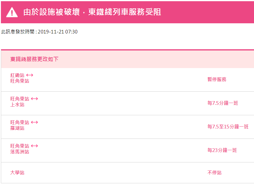 今日,東鐵線提供羅湖站、落馬洲站服務,但行車時間較長,旺角東站至羅湖站每7.5至15分鐘一班,旺角東站至落馬洲每23分鐘一班,紅磡站至旺角東站暫停服務。西鐵線紅磡站至尖角東站暫停服務。