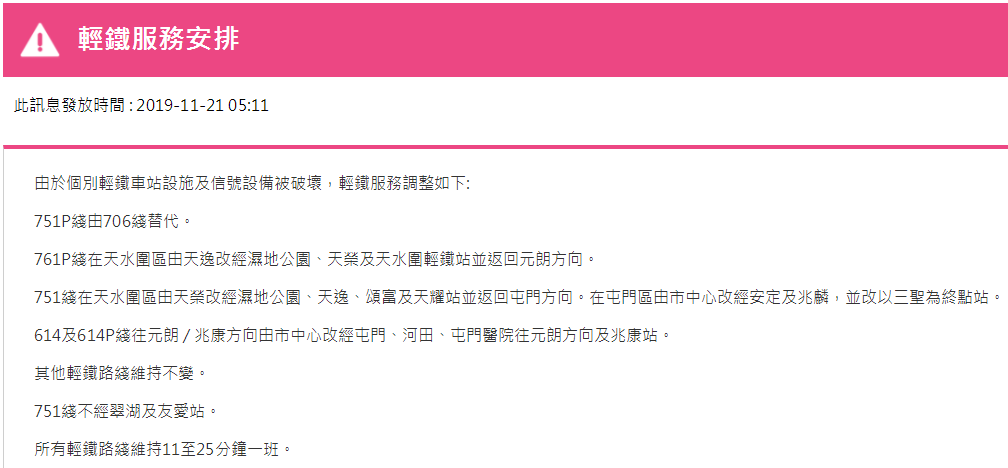 據(jù)港鐵消息,11月21日,香港地鐵各線(機場快線除外)、輕鐵及港鐵巴士的服務將于晚上11時結束。西鐵線/東鐵線紅磡站及大學站繼續(xù)關閉。需要注意的是,元朗站將于下午2時關閉,列車不停元朗站,此外,個別車站出入口會暫時關閉。
