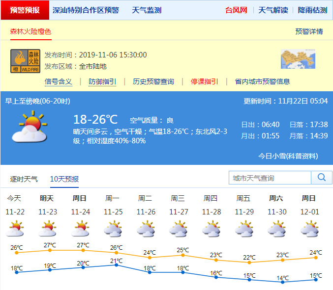 見(jiàn)圳客戶端·深圳新聞網(wǎng)2019年11月22日訊 深圳市氣象局預(yù)計(jì)22日晴天干燥,早晚清涼,氣溫18-26℃;23-24日多云間晴天,部分時(shí)間有輕霧或霾;25日夜間至26日冷空氣影響,北風(fēng)加大,氣溫略降;展望27日夜間冷空氣繼續(xù)補(bǔ)充,氣溫持續(xù)下降。
