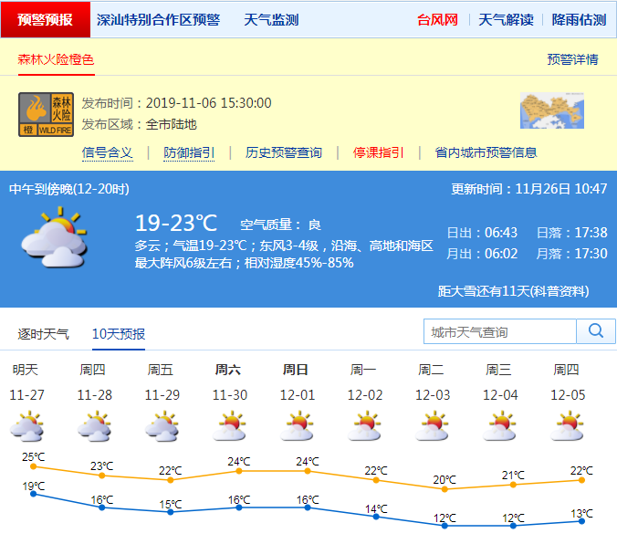 見(jiàn)圳客戶端·深圳新聞網(wǎng)2019年11月26日訊 記者從市氣象臺(tái)獲悉,26日多云,氣溫19-23℃;27日晴間多云,空氣干燥,早晚清涼,夜間新一股空氣開(kāi)始影響我市。