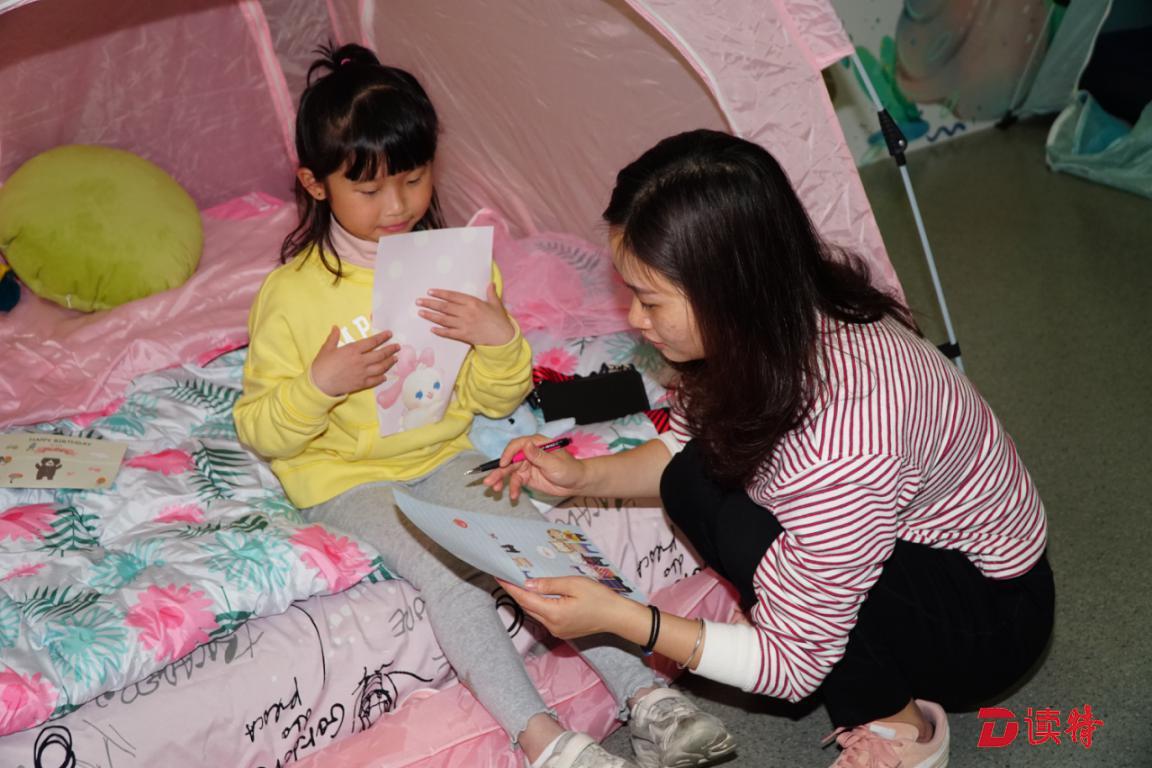 經過茶歇小憩之后,親子游戲讓孩子們樂不可支,在呼啦圈游戲中東穿西撞,在九宮格游戲中交朋結友,在去哪兒游戲里找不著北……這一晚的熱烈在閱讀推廣人鄧歡姐姐的晚安故事中沉淀下來,靜下心來寫下給未來自己的一封信。帳篷、星燈、繪本、游戲,給這30個親子家庭營造了一個個奇妙的童話夢境。