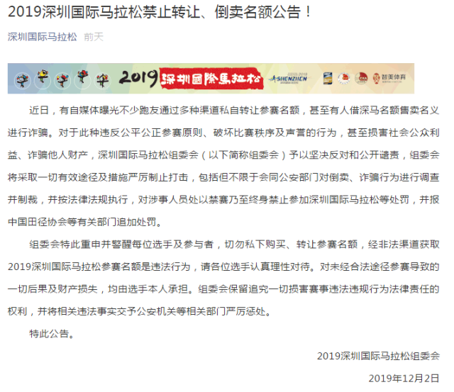 12月2日,深馬組委會(huì)發(fā)布公告,對(duì)于此種違反公平公正參賽原則、破壞比賽秩序及聲譽(yù)的行為,甚至損害社會(huì)公眾利益、詐騙他人財(cái)產(chǎn),深圳國(guó)際馬拉松組委會(huì)(以下簡(jiǎn)稱組委會(huì))予以堅(jiān)決反對(duì)和公開譴責(zé)。