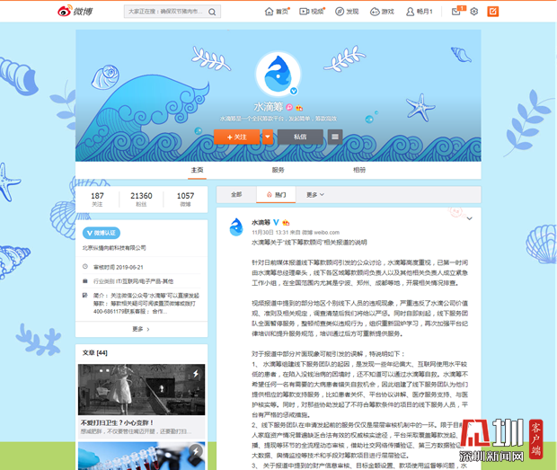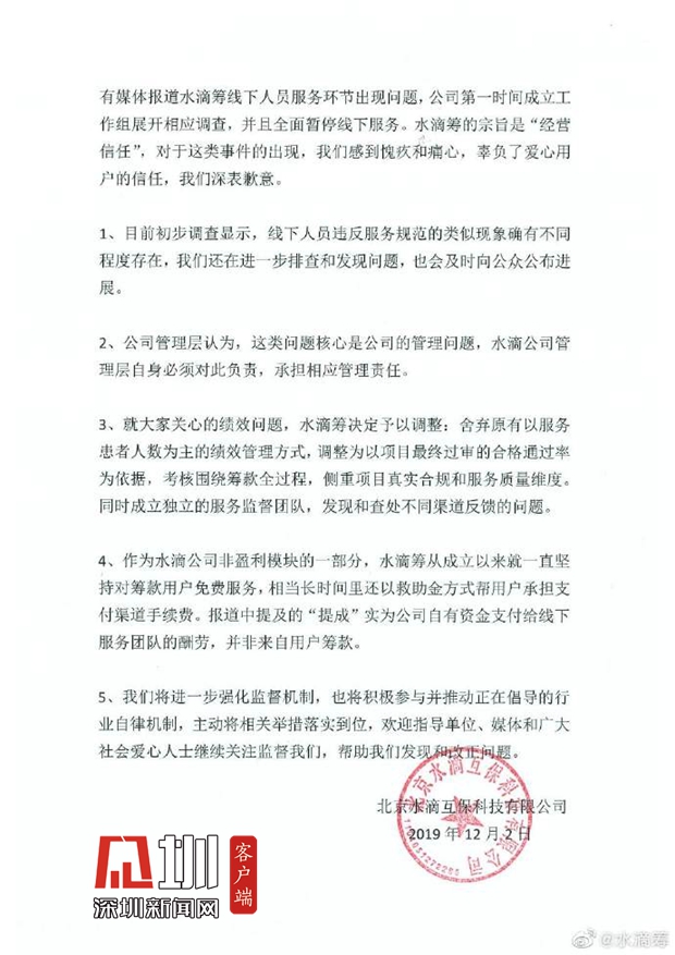 見(jiàn)圳客戶端.深圳新聞網(wǎng)2019年12月6日訊(見(jiàn)圳客戶端、深圳新聞網(wǎng)記者 張玲)2019年11月30日,據(jù)梨視頻報(bào)道,互聯(lián)網(wǎng)籌款平臺(tái)“水滴籌”在超過(guò)40個(gè)城市的醫(yī)院派駐地推人員,線下地推服務(wù)人員被指在醫(yī)院“掃樓”尋找求助者,套用模板,隨意填寫(xiě)金額,不審核甚至隱瞞求助者財(cái)產(chǎn)狀況,鼓勵(lì)患者大量轉(zhuǎn)發(fā)籌款信息。同日,水滴籌通過(guò)微博官方認(rèn)證公眾號(hào)回應(yīng)稱,已第一時(shí)間成立緊急工作小組開(kāi)展相關(guān)情況排查,同時(shí)線下服務(wù)團(tuán)隊(duì)全面暫停服務(wù),整頓徹查類似違規(guī)行為,并對(duì)梨視頻報(bào)道可能引發(fā)的誤解進(jìn)行了3點(diǎn)說(shuō)明。