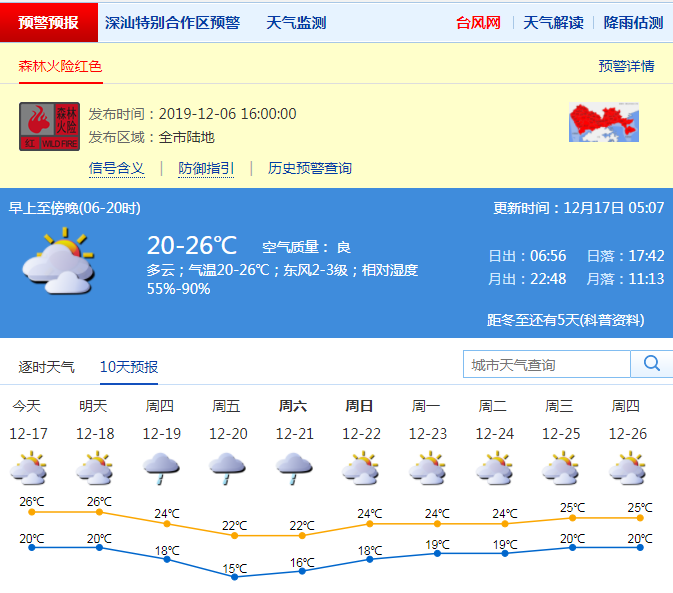 見圳客戶端·深圳新聞網(wǎng)2019年12月17日訊 深圳市氣象局預(yù)計(jì)17-18日多云,早晚有輕霧,天氣溫暖;19-21日受冷空氣影響,陰天間多云,有分散小雨,氣溫下降,天氣明顯轉(zhuǎn)涼。22日多云,氣溫回升。17-18日早晚有輕霧,注意交通安全。