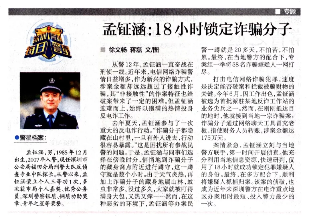 孟鉦涵,男,1985年12月出生,2007年入警,現(xiàn)任深圳市公安局福田分局刑警大隊反偵查專業(yè)中隊探長。從警以來,孟鉦涵榮立個人三等功1次,多次獲市局個人嘉獎、優(yōu)秀公務(wù)員,深圳警察銀質(zhì)、銅質(zhì)功勛獎?wù)?、青年之星等榮譽。