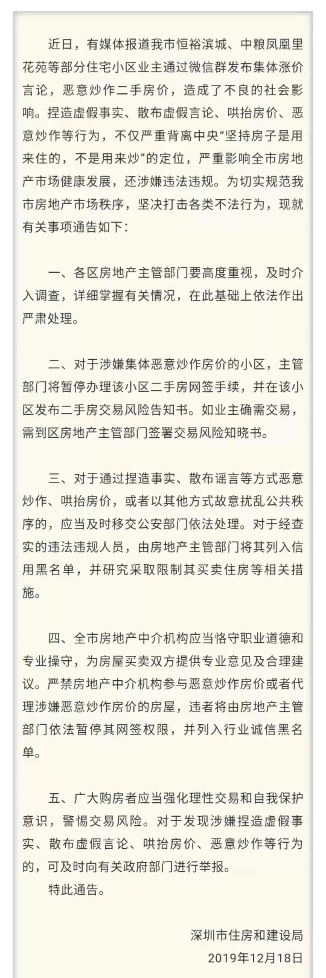 12月18號深圳市住建局發(fā)布通稿稱嚴厲打擊哄抬房價等違規(guī)行為