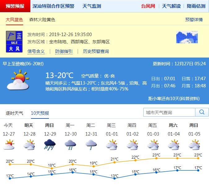 見(jiàn)圳客戶(hù)端·深圳新聞網(wǎng)2019年12月27日訊 昨日下午冷空氣已經(jīng)開(kāi)始逐漸影響我市,風(fēng)力有所加大,沿海高地最大陣風(fēng)已達(dá)到6-7級(jí)。市氣象臺(tái)預(yù)測(cè),受冷空氣+臺(tái)風(fēng)聯(lián)合影響,29-30日我市將有一次大雨到暴雨降水過(guò)程。