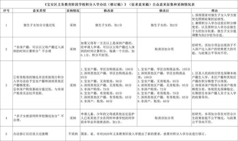 據(jù)了解,《寶安區(qū)義務(wù)教育階段學(xué)校積分入學(xué)辦法(修訂稿)》(征求意見稿)主要的修訂內(nèi)容是錄取方式和積分項(xiàng)目的變化和調(diào)整,在征求意見期間共收到市民朋友提出的意見892條。寶安區(qū)教育局將涉及面較廣、具有普遍性的意見進(jìn)行分類回復(fù)并予以公示,同時將經(jīng)論證修改后的修訂稿一并公示。市民如有新的建議可在1月9日前發(fā)郵件到 jcjyk@baoan.gov.cn進(jìn)行反饋。