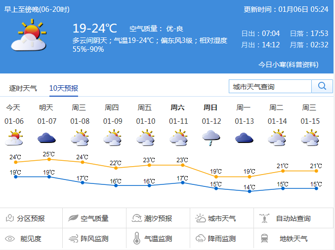 見圳客戶端·深圳新聞網(wǎng)2020年1月6日訊 據(jù)深圳市氣象臺消息,預(yù)計本周初深圳多云間陰天,早晚有零星小雨和輕霧;周三至周四受弱冷空氣影響,沿海和高地陣風(fēng)6~7級,早晚清涼;周五至周六多云,氣溫回升,周日受冷空氣影響,氣溫再次下降。