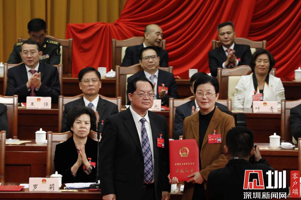 深圳市人大常委會主任駱文智(左)為新當選的市人大常委會副主任裴蕾(右)頒發(fā)當選證書。