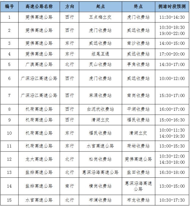各主要高速公路擁堵時(shí)段預(yù)測(cè)如下: