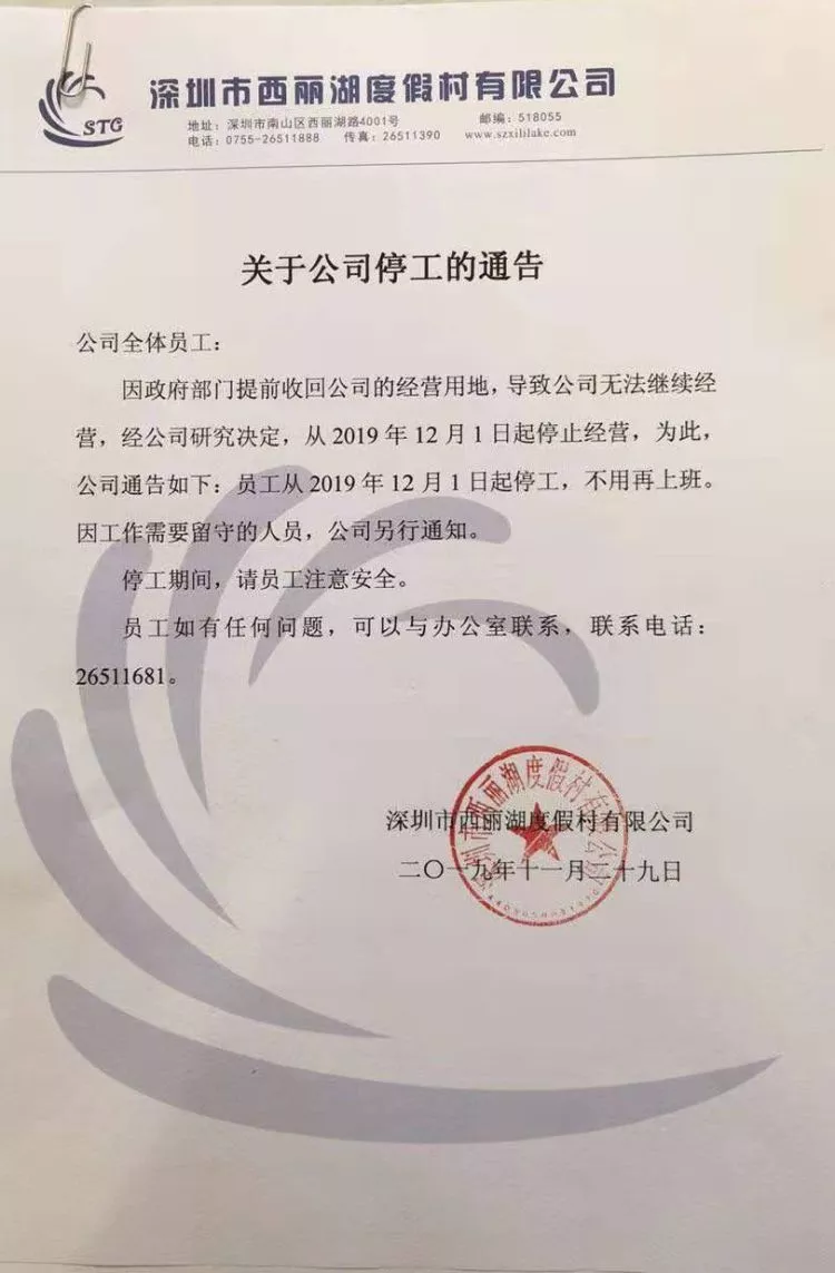 2019年11月29日,西麗湖度假村發(fā)布通告稱,政府提前收回經(jīng)營(yíng)用地,從2019年12月1日停止?fàn)I業(yè),已經(jīng)不接待外來(lái)游客,員工同時(shí)停工——這意味著市民所熟知的西麗湖度假村即將走下舞臺(tái)。