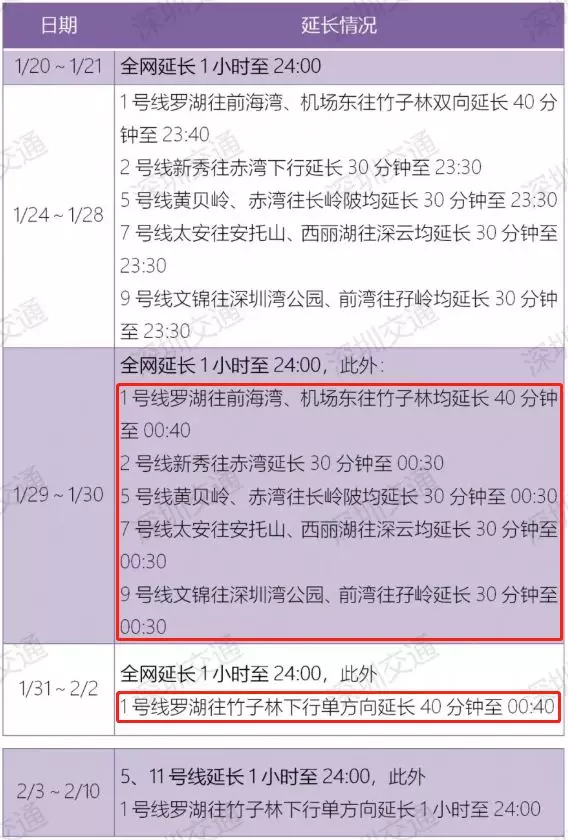 2020年春運(yùn)期間深圳地鐵延長情況表