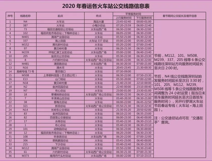 見圳客戶端·深圳新聞網(wǎng)2020年1月20日訊 又將迎來離深高峰,為方便大伙趕高鐵火車,深圳的公交地鐵都開啟最強加班模式,延長服務(wù)時間。很多小伙伴就很關(guān)心,途經(jīng)各大火車站的公交線有哪些?運營的時間是幾點?