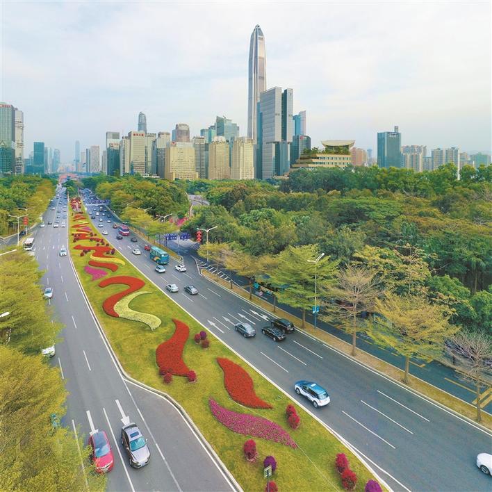 深南大道中間綠化帶呈現(xiàn)的鳳凰飛羽圖案。