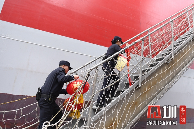 鹽田邊檢站登輪送春聯(lián)、燈籠,將中國年送上國際船舶。